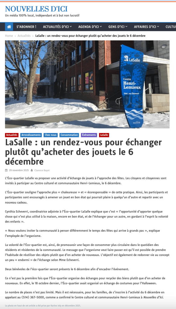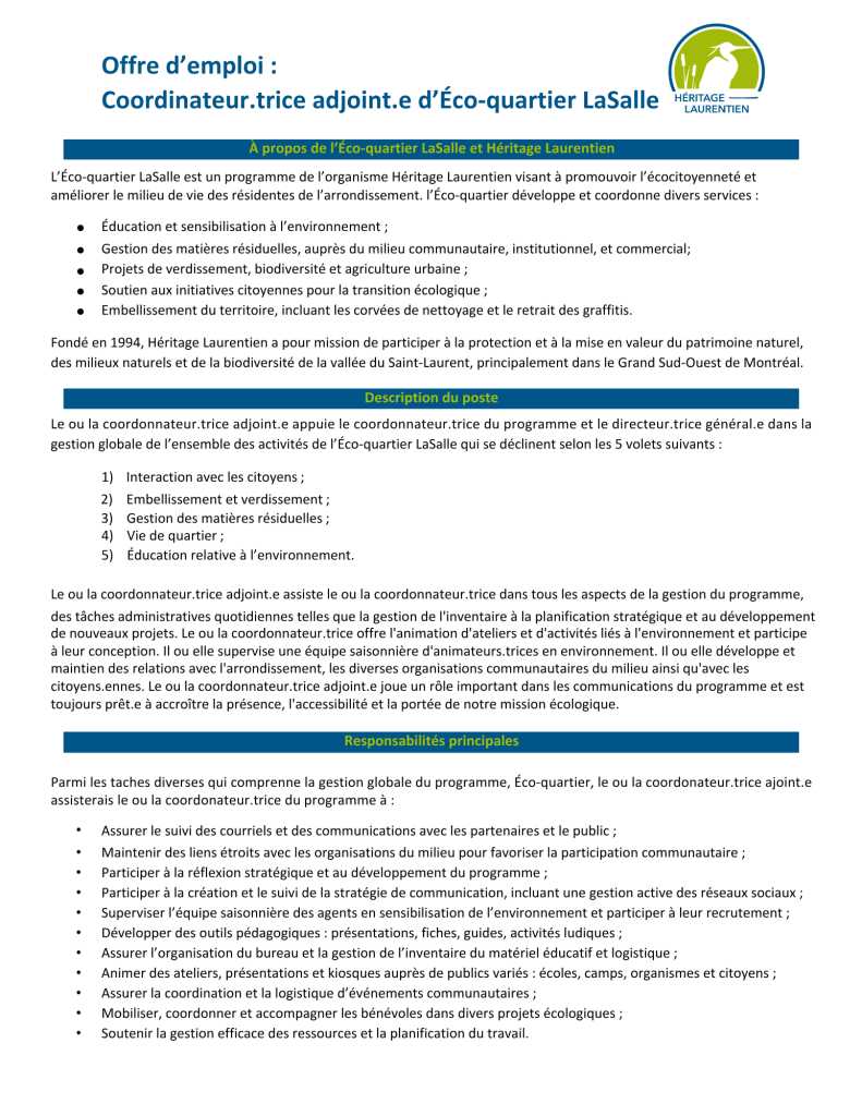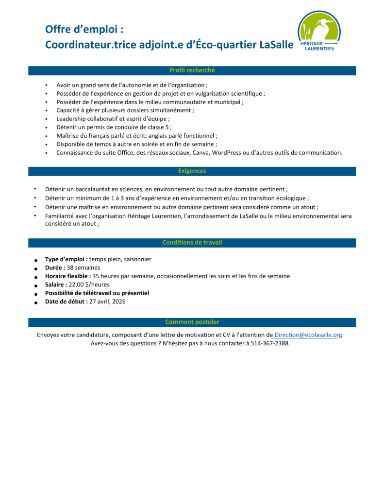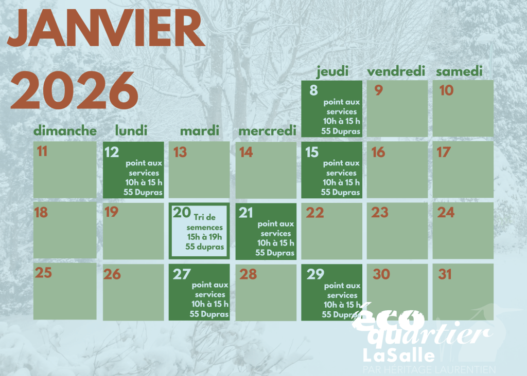Ce programme a pour mission de promouvoir l’écocivisme et de contribuer à l’amélioration du cadre de vie des habitant.es de LaSalle. Il vise à éveiller la conscience écologique, à renforcer le lien entre la population et son environnement et par l’implication de la communauté, à préserver un milieu de vie sain, durable et enrichissant pour tous.